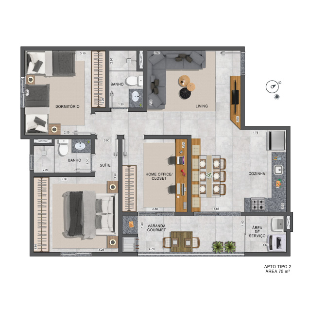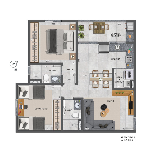 São 02 plantas com 64m² e 75m², ambas com sala ampla com dois ambientes,  02 quartos sendo 01 suite, Varanda Gourmet,  Cozinha, Banheiro, Área de Serviço e 01 vaga.