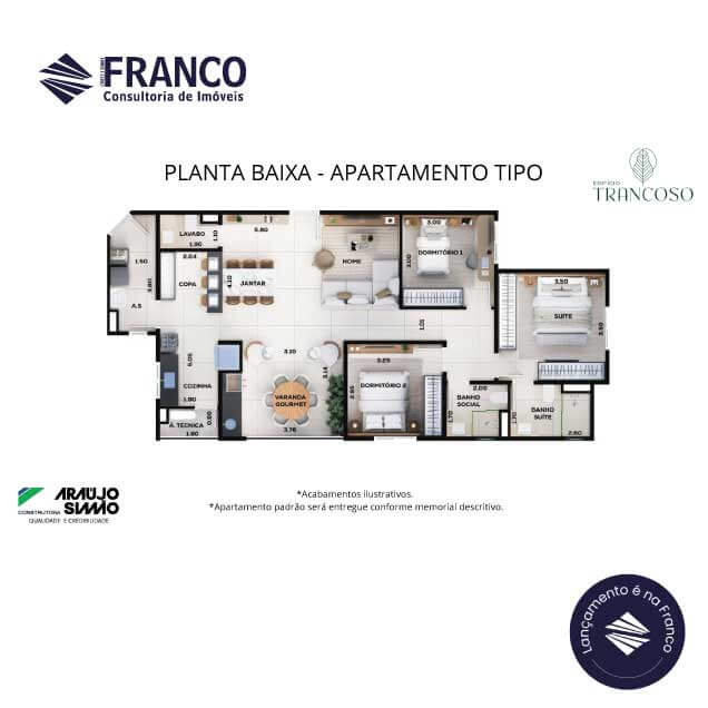 Serão 4 apartamentos por andar, cada um com 3 dormitórios, os moradores experimentarão uma combinação perfeita de privacidade e conforto em todos os detalhes.